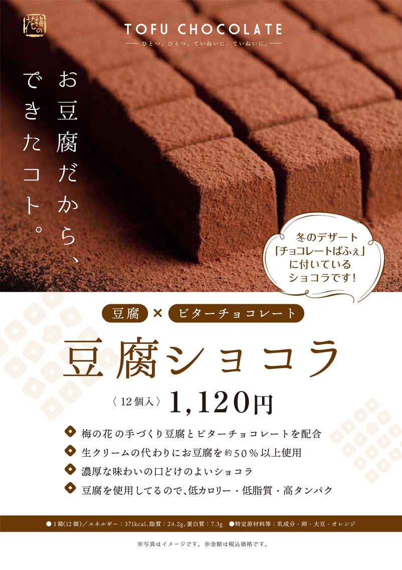 梅の花の手づくり豆腐とビターチョコレートを配合。生クリームの代わりにお豆腐を約50%以上使用した濃厚な味わいの口どけのよいショコラ。チョコレートぱふぇにも添えております。テイクアウトコーナーにて販売中です。