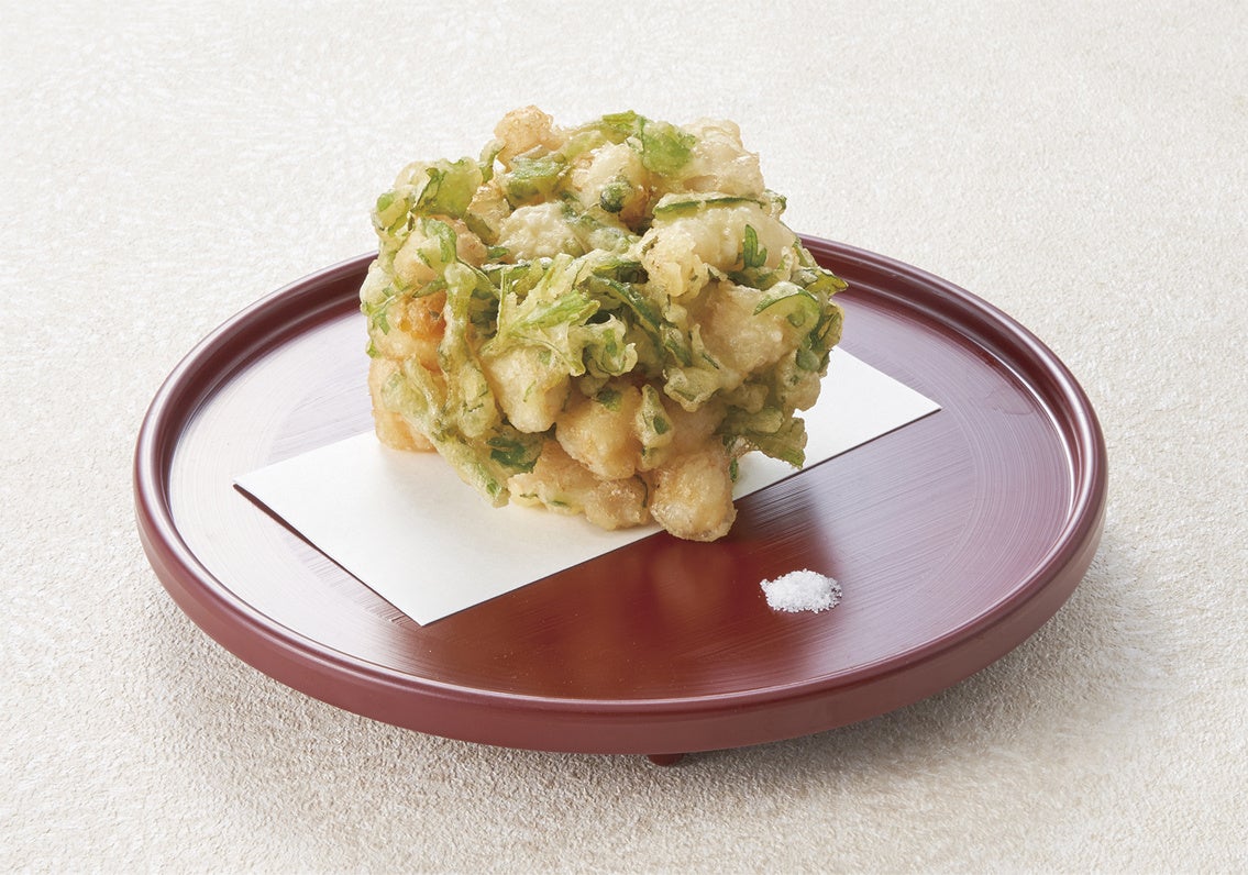 旨みのある小柱と海老に蓮根や里芋を加え、かき揚げにしました。サクサクの食感をお楽しみください。