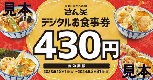 「デジタルお食事券430円分」は、「天丼・天ぷら本舗 さん天」各店舗でご利用いただけます。