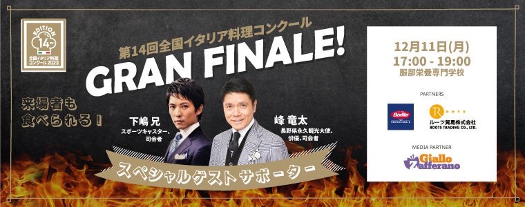 将来のイタリア料理界を牽引する若手イタリア料理シェフの登竜門、在日イタリア商工会議所主催全国イタリア料理コンクール「Gran Concorso di Cucina」決勝大会がついに開催。今年はスペシャルゲストサポーターとして、峰竜太さん、下嶋兄さんが決定しました!
