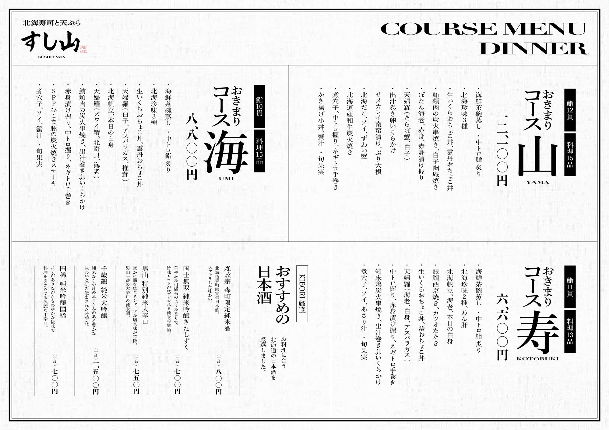 牧場BBQをテーマに北海道ならではの食材で鉄板焼きを提供していた「DAICHI」(7階)は、「北海もんじゃ×鉄板しゃぶしゃぶ KIBORI」に。新鮮で美味しい海鮮料理が楽しめる「UMI」(6階)は「北海寿司と天ぷら すし山 新宿」としてリニューアル。新鮮な海鮮をこれまで以上に美味しく召し上がっていただくために、コース仕立てのお寿司をメインとしています。