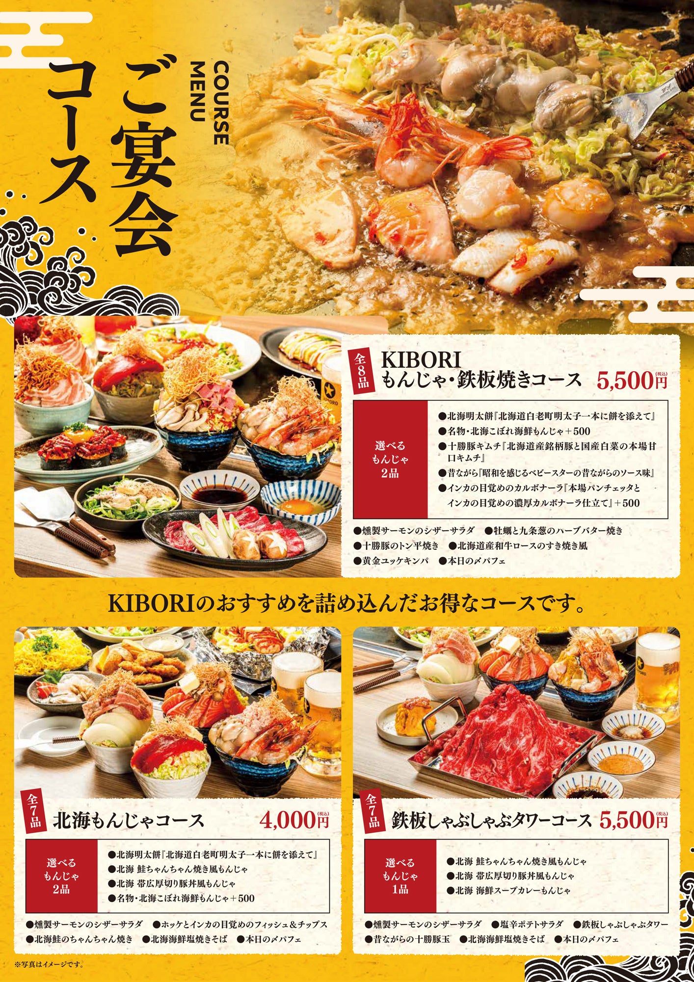 看板メニューをダブルで堪能いただける『KIBORIもんじゃ・鉄板焼きコース』全7品!宴会や飲み会、女子会などにピッタリの当店イチオシのコースです。看板メニューの北海もんじゃやバラエティ豊かな創作もんじゃが選べる充実コースとなっております。
