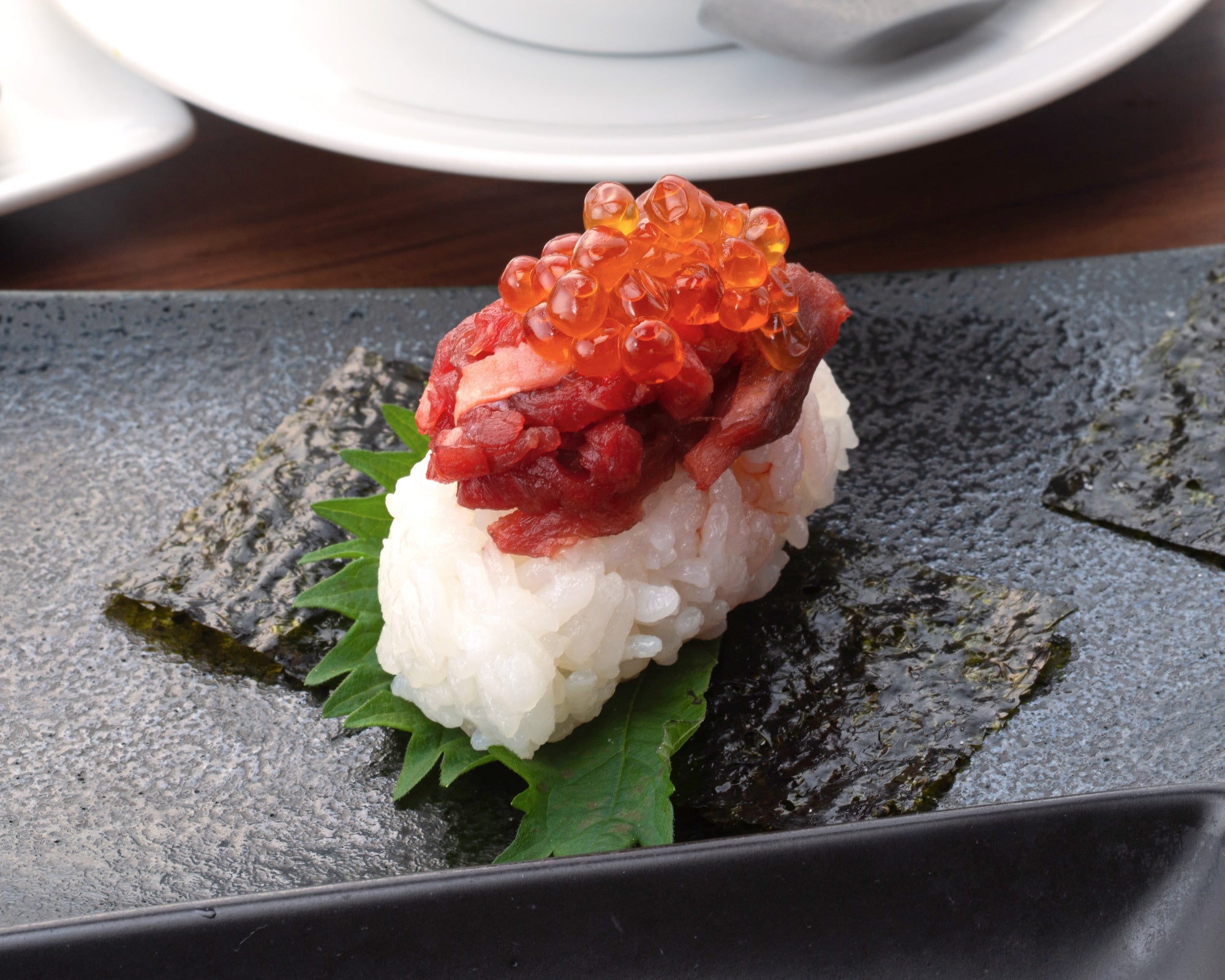 ユッケといくらをシャリの上にのせて食べる肉寿司「にくいくら」。肉の旨みそのものとプチプチいくらの食感をお楽しみいただけます。