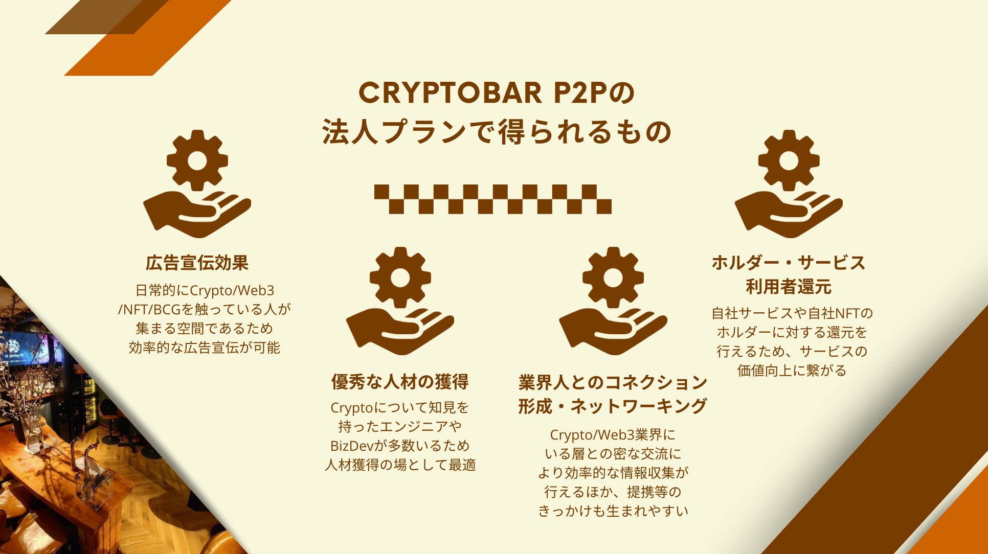 株式会社0xP2Pが運営しているクリプトユーザー向けのリアルスペース・Bar「CryptoBar P2P」では法人向けの各種プランを用意しています。この度、より多くのニーズに応えられるよう、法人プランの内容を大幅に拡充してプランを整備いたしました。