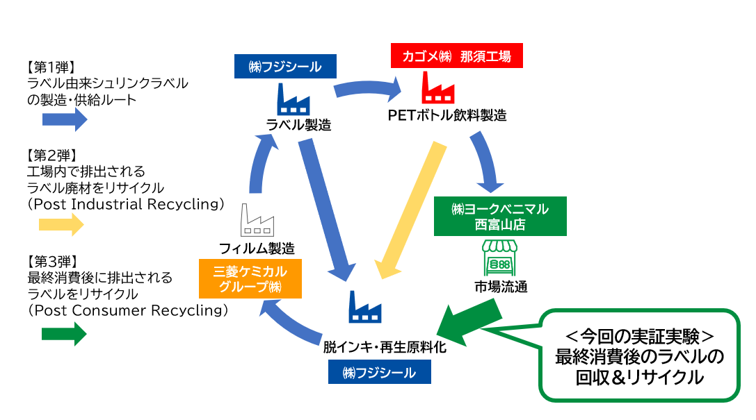 このシュリンクラベルは、フジシールがペットボトルの使用済シュリンクラベルから印刷インキを剥離し、三菱ケミカルグループの製膜技術により資源を有効活用し新しいラベルに再生したものです。回収されたラベルは再び脱インキ処理され、再生原料としてラベルに加工されます。