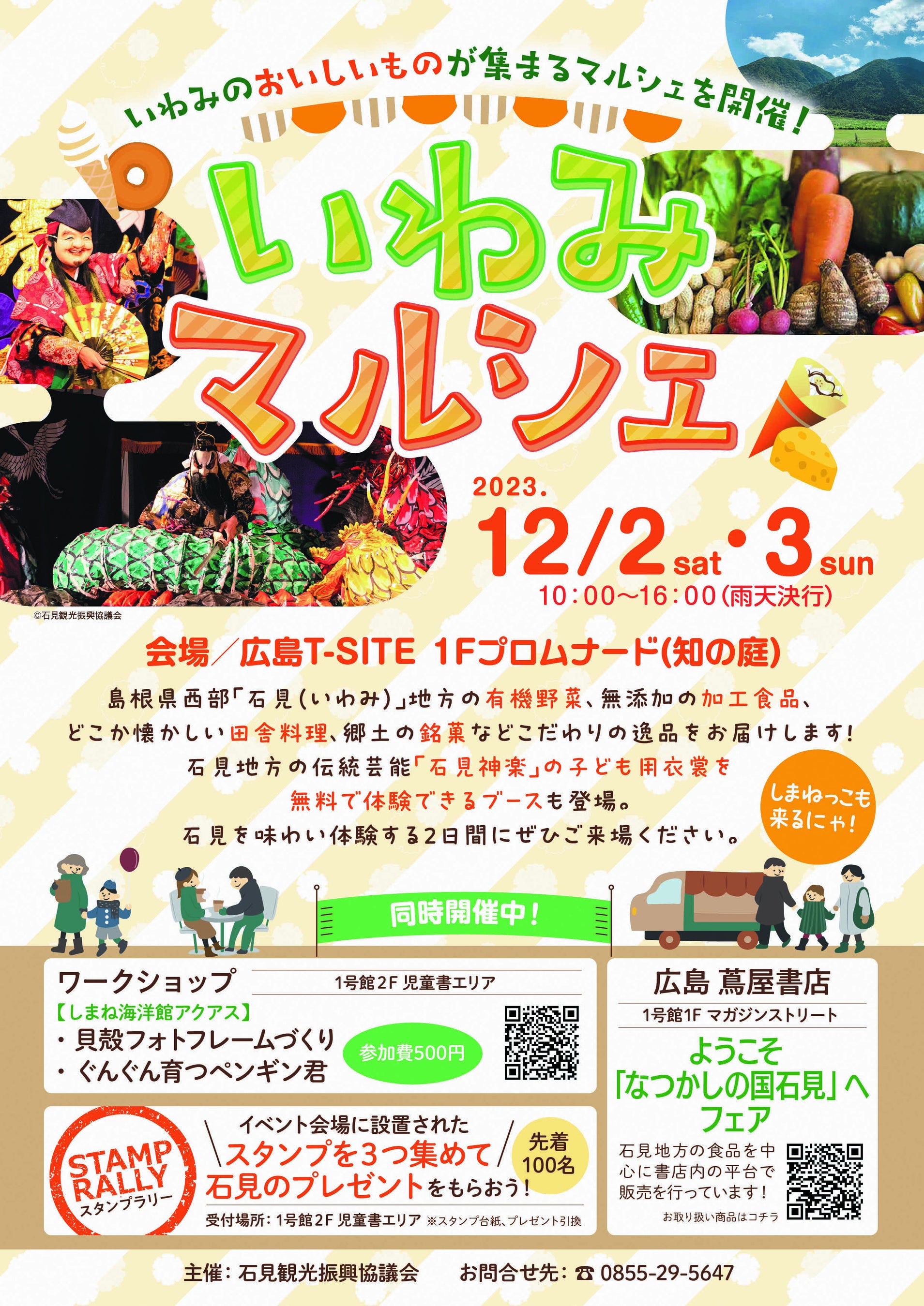 石見のおいしいものが集まるマルシェを開催!有機野菜、無添加の加工食品、郷土の銘菓などこだわりの逸品をお届けします。12月2日~3日には石見神楽の子ども衣裳着付け体験も行います。
