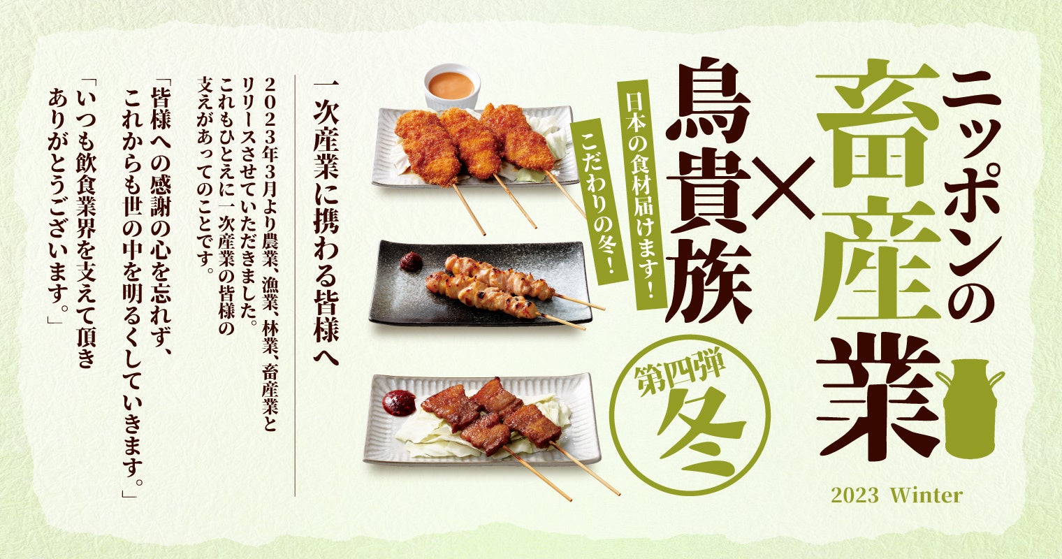 鳥貴族の成長を支えてくださっている日本の生産者に感謝するとともに、国産国消のさらなる推進を目指す「日本の一次産業感謝!応援メニュー」の最後を締めくくる第四弾では、「畜産業」にスポットを当てたメニューをご用意しました。