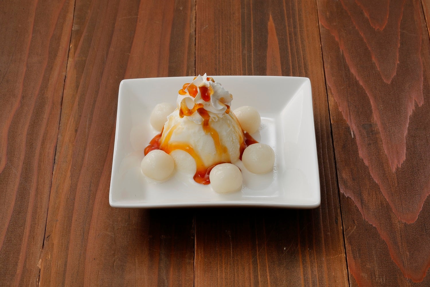 ヒラヤミルクアイスにみたらしのたれと生クリーム使用のホイップをトッピングし、あったかい白玉を添えた新感覚のデザート!