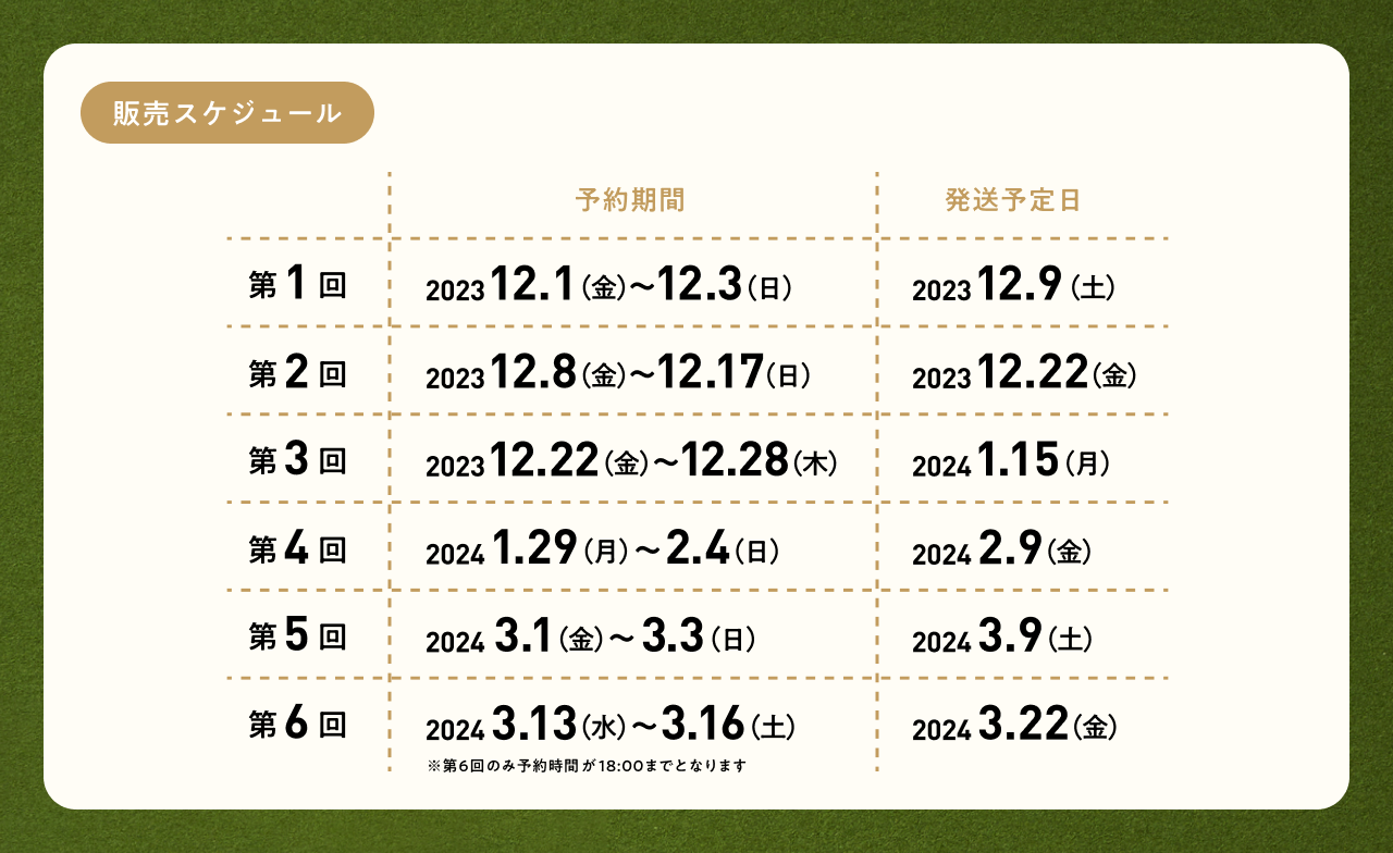 前回ご購入いただけなかったお客様にもお楽しみいただけるよう、今回は6回に分けて数量限定で販売いたします。一年頑張った自分へのご褒美や大切な人と一緒に語り合う時間のお供に、ぜひお選びください。