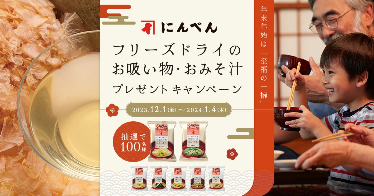 本キャンペーンでは、キャンペーン期間中に簡単なアンケートにお答えいただいた方の中から、抽選で100名様に鰹節専門店「にんべん」様ご提供、「至福の一椀 お吸い物・おみそ汁」5個セットをプレゼントいたします。
