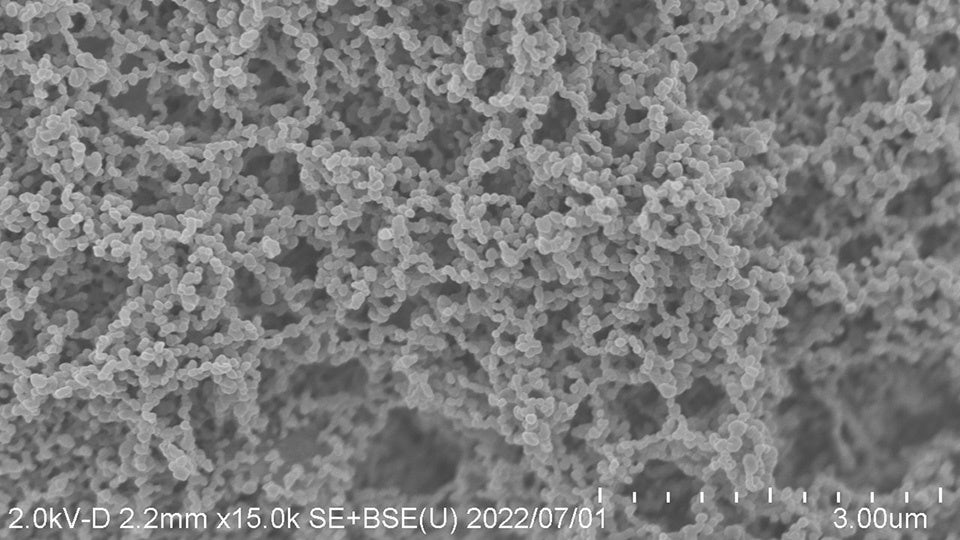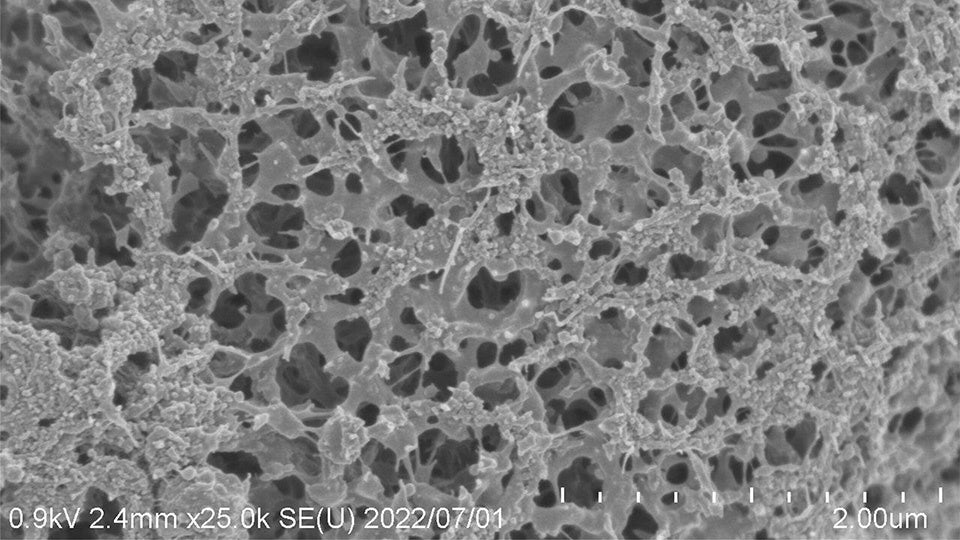 電子顕微鏡を使用して船橋屋のくず餅を分析したところ、200~300ナノメートル(※1)ほどの架橋構造があることを世界で初めて確認。均一的に構造が広がっており、この構造により船橋屋のくず餅の特徴である独特の弾力・食感を創り出していることが明らかになりました。