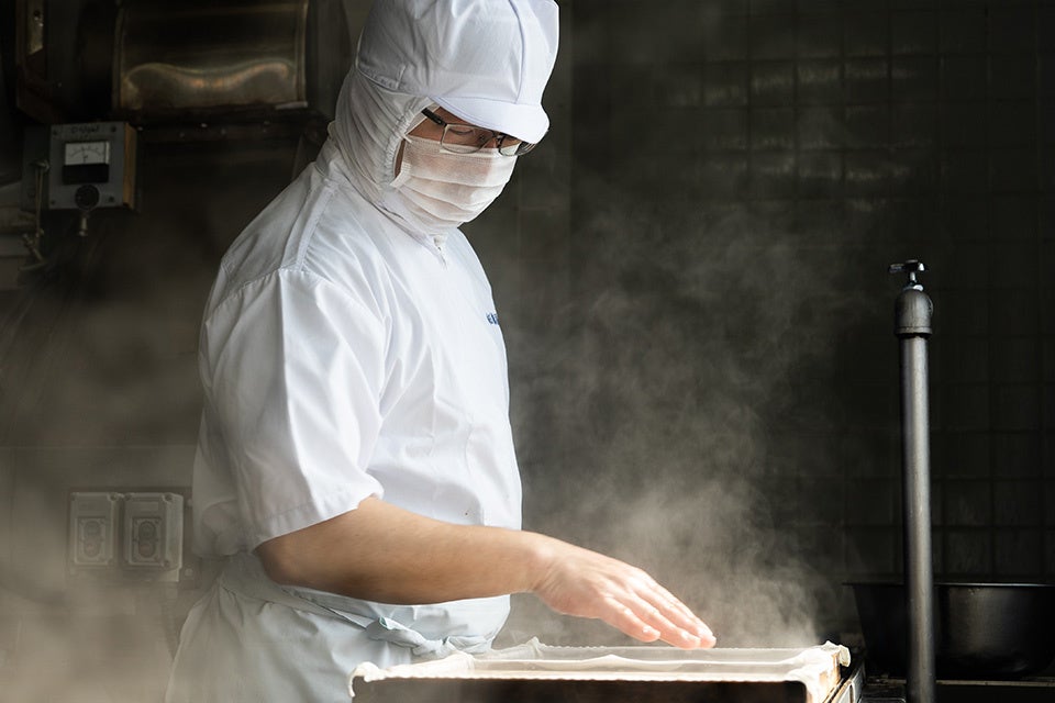 一般社団法人100年経営研究機構と連携し、「くず餅を科学する」をコンセプトに、江戸時代から続く発酵菓子のくず餅と代々受け継がれてきたくず餅の製造技術について、科学的根拠に基づいて分析をしております。この度、ヤマザキ動物看護大学教授の長島孝行氏にご協力いただき、くず餅の独特な食感がどういう構造から生まれるのか、そしてその構造がどう構築されているのかを、ナノレベルで構造解析しました。