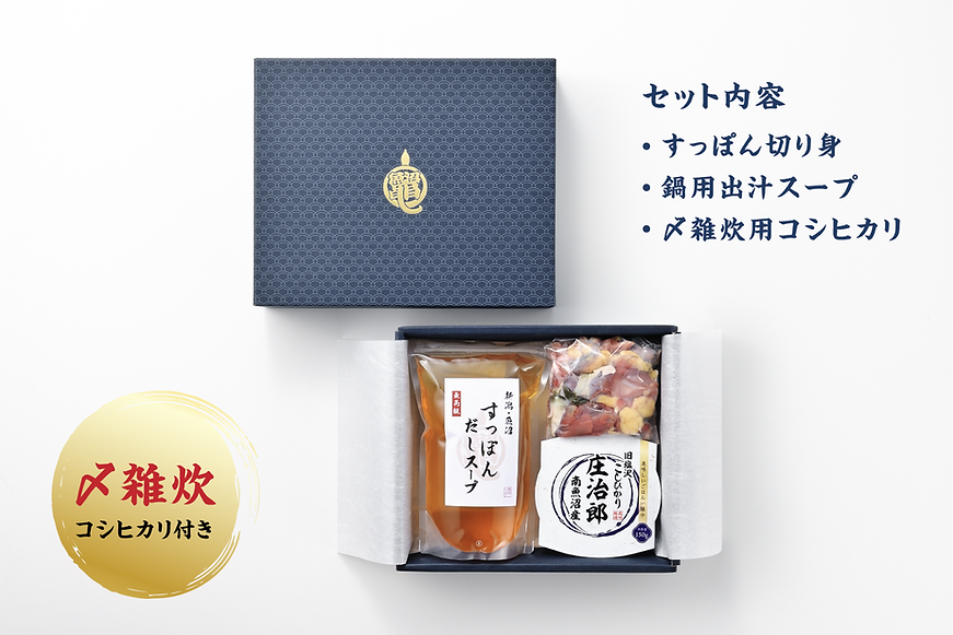さらに、お鍋用スッポン出汁スープと〆の雑炊用コシヒカリも同封いたします。ご家庭で手軽にお楽しみいただけます。