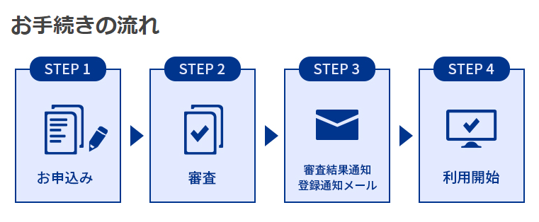 ・お手続きの流れ:お申込み→審査→審査結果通知/登録通知メール→利用開始