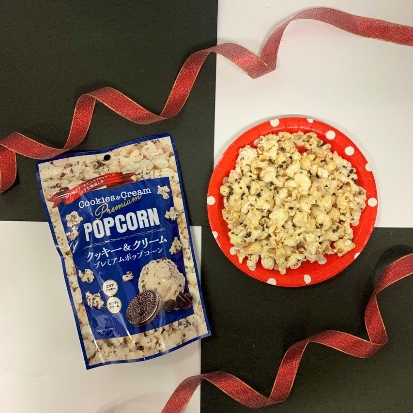 大人からこどもまで幅広い世代に好まれる人気フレーバー、クッキー&クリーム味のポップコーンが登場!塩味のポップコーンにホワイトクリームをたっぷりとからめるようにかけ、砕いたココアクッキーを全体にまぶすことで贅沢な味わいに仕上げました。ホワイトクリームの濃厚な甘さとココアクッキーのほろ苦い風味、ポップコーンの塩気が絶妙に合わさった甘じょっぱい味わいが堪能できます。サクサク食感と相まってやみつきになること間違いなし!おやつにはもちろん、パーティーシーンなど大人数で集まる際のお菓子や映画鑑賞のお供にもぴったりです。今の時期にしか味わえないプレミアムなポップコーンで贅沢なひとときをお楽しみいただけます。
