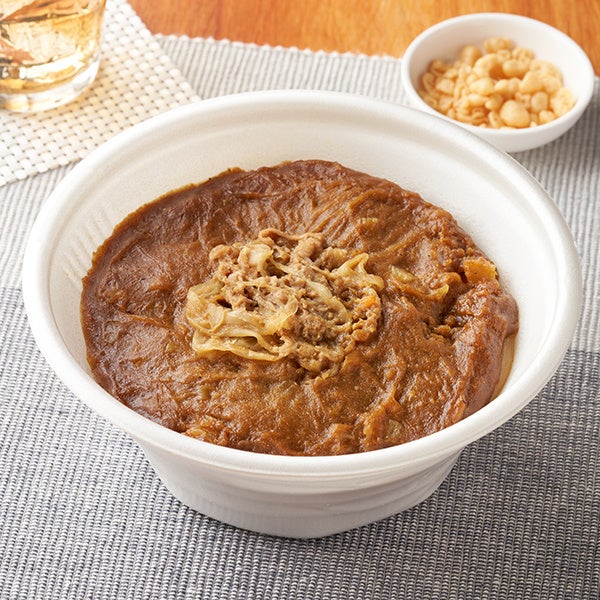 【内容】資さんうどん監修による「カレーぶっかけうどん」です。カレーは、すりおろしりんごやチャツネを合わせることで、口当たりは甘く、後味はスパイシーな味わいを感じられるように仕立てました。カレールーで和えた牛肉と玉ねぎ煮をトッピングして、資さんうどんでもお馴染みの「揚げ玉」小袋を付けました。