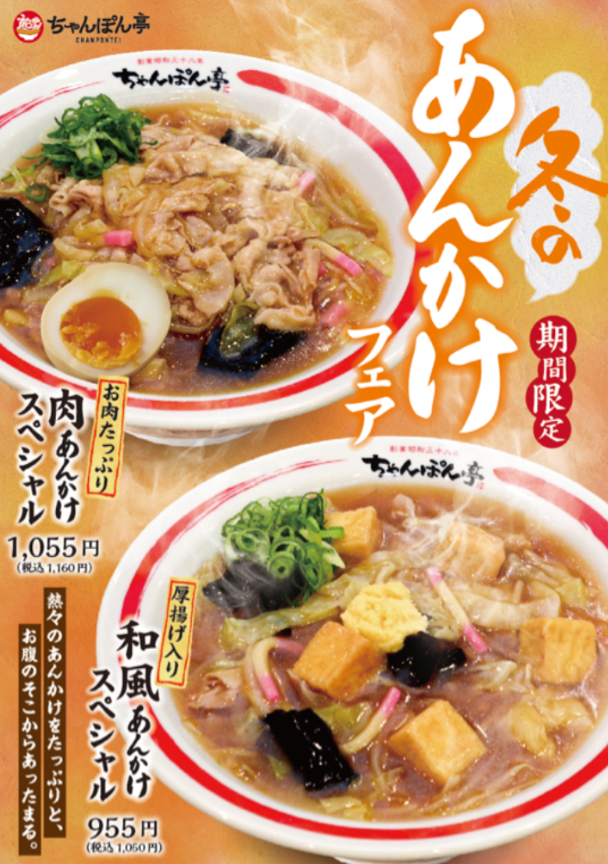 近江ちゃんぽんをニッポンのちゃんぽんに!」をブランドビジョンに、「近江ちゃんぽん亭(以下同店という)」を展開するドリームフーズ株式会社(滋賀県彦根市 代表取締役 山本英柱、以下同社という)は、2023年12月5日から期間限定で「冬のあんかけフェア」を開催。身体が温まるお肉たっぷりの「肉あんかけスペシャル」と厚揚げ入りの「和風あんかけスペシャル」をこの機会に一度お試しください!!