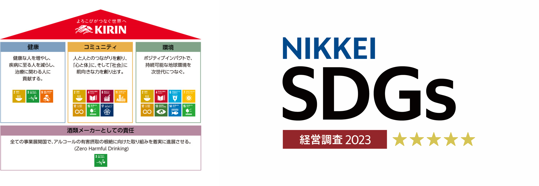 当社は、長期経営構想「キリングループ・ビジョン2027(以下、KV2027)」において、「食から医にわたる領域で価値を創造し、世界のCSV※1先進企業となる」ことを目指しています。社会と価値を共創し持続的に成長するための指針である「キリングループCSVパーパス(以下、CSVパーパス)」の実現に向けてグループ全体でCSV経営を推進し、社会的価値に加えて事業を通じた経済的価値の創出にも取り組んでいます。「酒類メーカーとしての責任」「健康」「コミュニティ」「環境」それぞれの社会課題の解決に取り組むことを通じて、当社はSDGsへの貢献を目指してきました。
