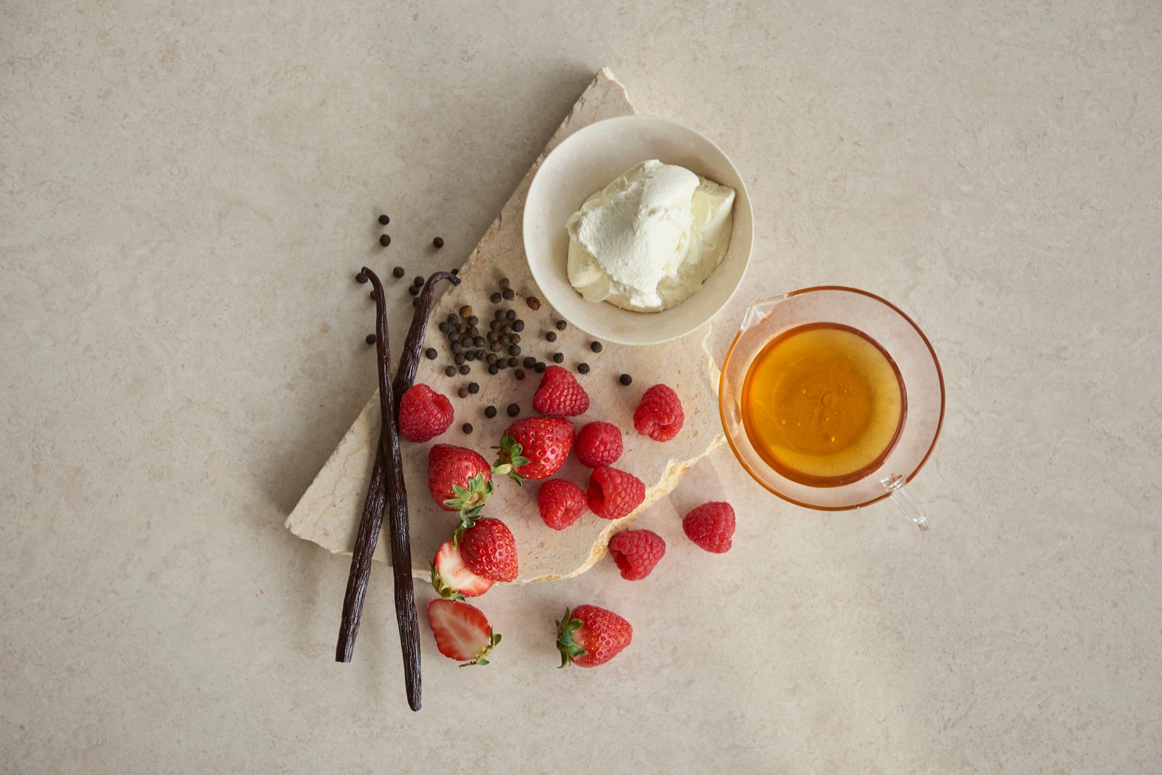 初雪のような純白に仕上げたケーキに、2種類の赤いベリーを組み合わせたホリデー限定フレーバー。どこか懐かしさを感じさせるバニラやマスカルポーネ、はちみつの甘く柔らかい味わいに、ホリデーシーズンらしい赤色が際立つ2種類のベリーの軽やかな酸味で華を添えました。そこへマーガオのすっきりとした透明感のある香りで全体の味わいを美しくまとめ上げています。