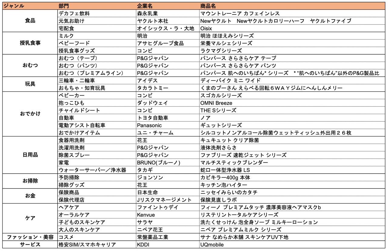 「最優秀賞」には、子どものことが考えられていて高品質でありながら、使い勝手や汎用性に優れた商品がランクイン。フリーコメントでは、食事やおむつなど頻繁に手に取るものほど「持ち運びやすい、出先でも使い勝手がいい、お出かけの時はこれだけでいいのが助かる」といったものがあり、コロナ後のお出かけ需要の高まりを推測できます。また家電では「使えるシーンがいくつもある」、洗剤では「親子で使える」といったコメントが多く、日用品ジャンルは多機能でコスパにすぐれたものが、忙しい子育て世代の支持を集めているようです。