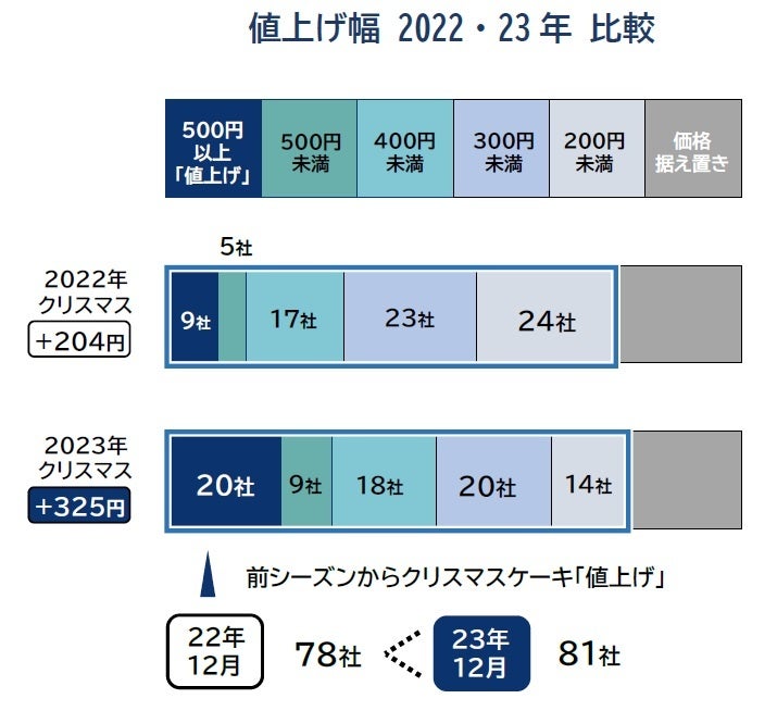 前年から価格が上昇したケーキをみると、値上げ幅として最も多いのは「500円以上」と「300円未満」で、それぞれ20社に上った。500円以上の値上げは百貨店や洋菓子店において主力となる4000~5000円台の中高価格帯ケーキで、300円未満の値上げは量販店やスーパーなどで販売される3000円台のケーキに多くみられた。以下「400円未満」(18社)、「200円未満」(14社)、「500円未満」(9社)と続き、調査対象の100社のケーキのうち、昨シーズンから前年から価格が上昇したケーキは81社に上った。ただ、500円以上値上げした企業は昨シーズンに比べて倍増した一方、値上げ幅を「200円未満」に抑えた企業は14社・10社減となるなど、大幅値上げを決断したクリスマスケーキが目立った。