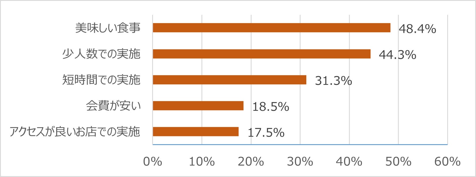 「美味しい食事」(48.4%)、「少人数での実施」(44.3%)、「短時間での実施」(31.3%)といった回答が多かったです。