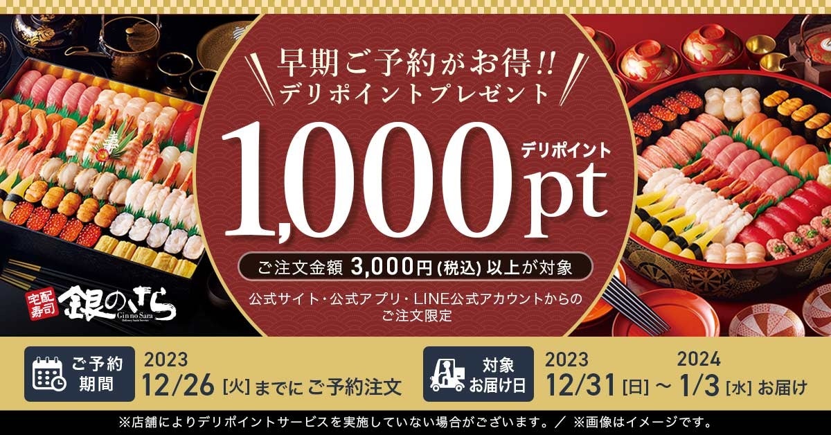 2023年12月26日(火)までに公式サイト・公式アプリ・LINE公式アカウントからご注文いただいた方限定で、2023年12月31日(日)~2024年1月3日(水)のお届けで、「デリポイント※」を1000ポイントプレゼントいたします。(ご注文金額3,000円(税込)以上対象)