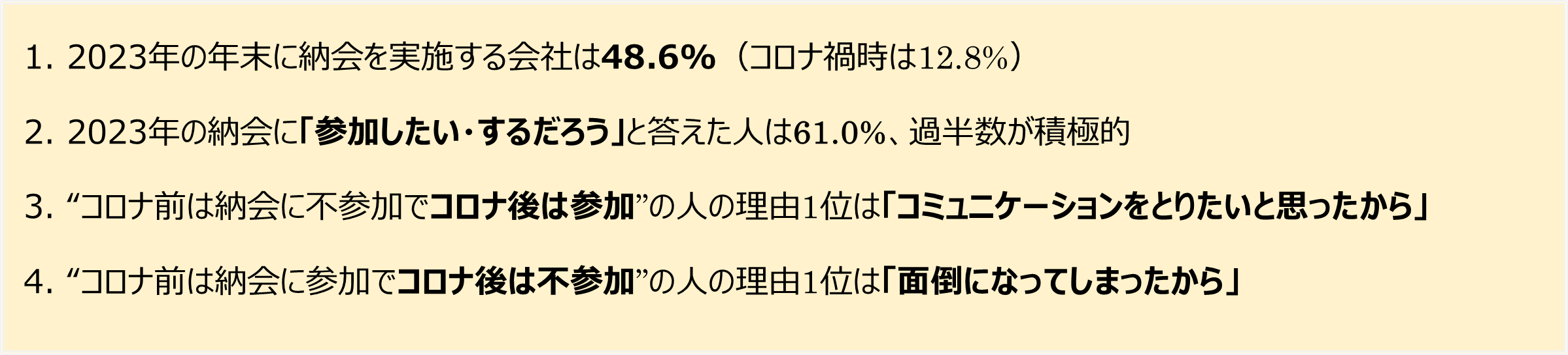 コロナ禍を経て、人間関係の変化や、納会に対するスタイルが変化したことで意識の変化が生まれたのではないでしょうか。