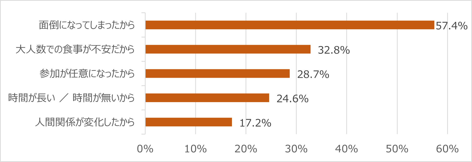 一方で、コロナ前は納会に参加していたものの、コロナ後に行きたくなくなってしまった人(122人)も、全体の21.9%と比較的多い傾向にありました。理由としては、「面倒になってしまったから」(57.4%)、「大人数での食事が不安だから」(32.8%)、「参加が任意になったから」(28.7%)などの理由が上がりました。