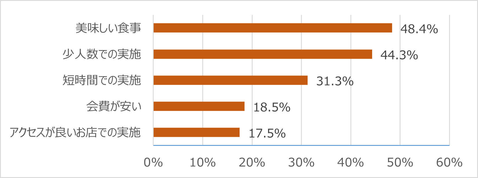 「美味しい食事」(48.4%)、「少人数での実施」(44.3%)、「短時間での実施」(31.3%)といった回答が多かったです。