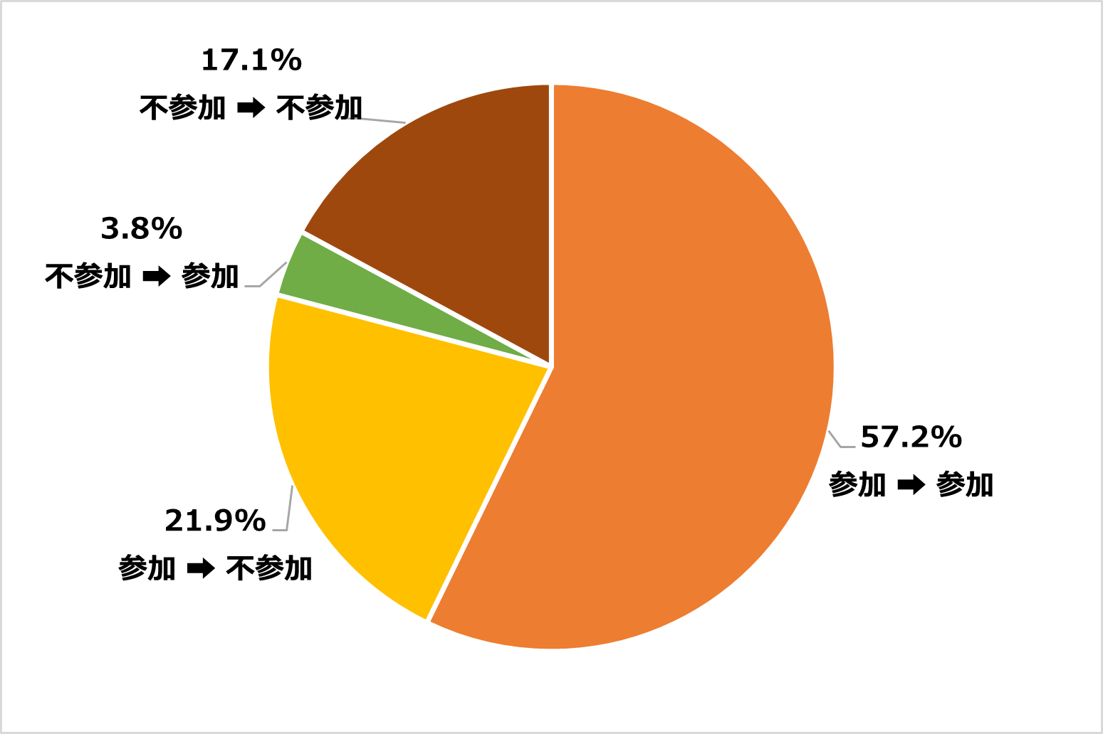 コロナ前に納会に参加していたけれど、コロナ禍を経て参加しないという気持ちに変化した人は21.9%、逆に、コロナ前に納会に参加していなかったけれど、コロナ禍を経て参加するという気持ちに変化した人は3.8%いるという結果になりました。