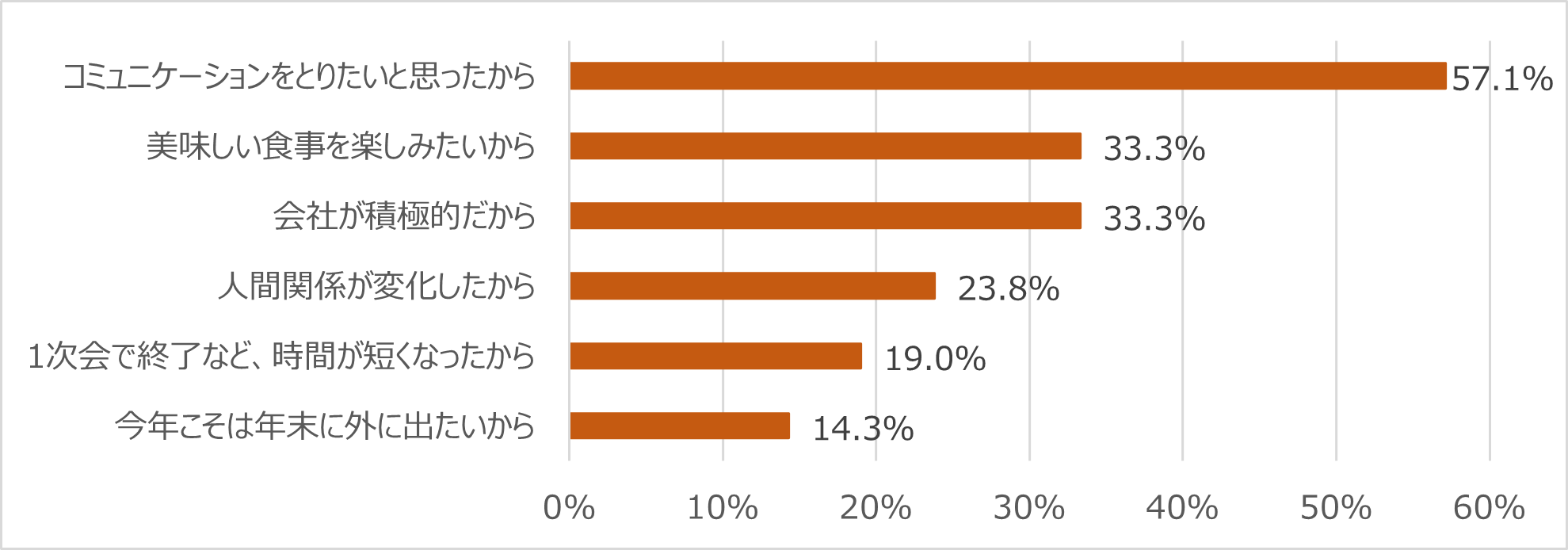 コロナ前は納会に不参加だったが、コロナ後に参加したい(21人)と答えた理由1位は、「コミュニケーションをとりたいと思ったから」(57.1%)でした。次いで、「美味しい食事を楽しみたい」、「会社が積極的だから」(共に33.3%)という結果でした。
