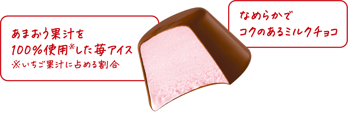 ①あまおう果汁を使用した苺アイスを、なめらかでコクのあるミルクチョコでコーティングした、ひとくちアイスです。