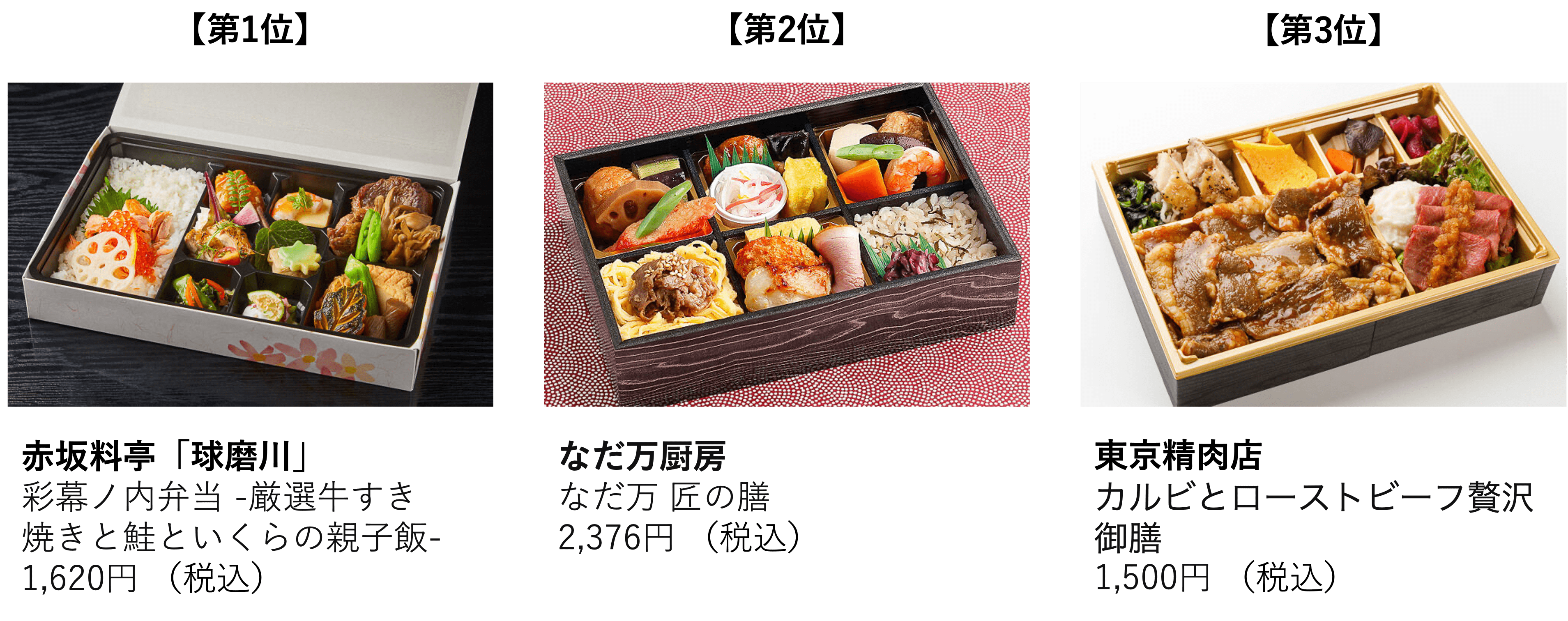 「エリア別No.1」においては、1,000円〜2000円程度まで多様な価格帯の商品が並び、和食なかでも和牛・蟹・いくらなど豪華な食材が使用されているお弁当や品数が豊富なお弁当が支持されました。