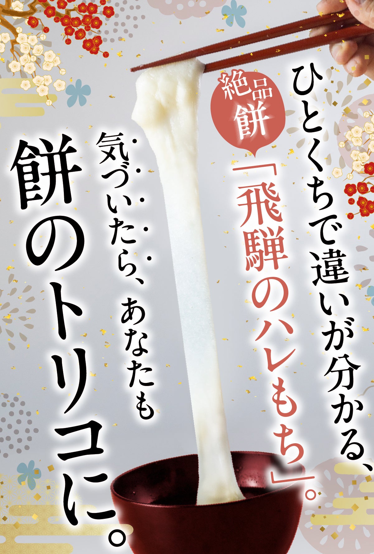 元々ハレの日に神様に捧げる神聖なものだったお餅は、長く切れないことから長寿を願う意味が込められています。そんな縁起の良いお餅を、真っ白で伸びが良いたかやまもちを使って、お正月をはじめとするハレの日にもっと楽しんでほしいと生まれたのが”飛騨のハレもち”です。