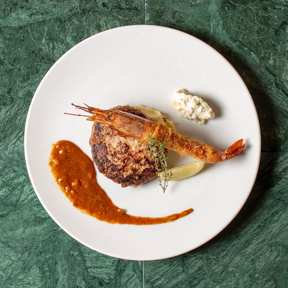 シグニチャーメニューである洋食の王道であるハンバーグと大ぶりな有頭海老フライのコンボプレートでは、甘味とコクのあるもろみ味噌とデミグラスソースを合わせ、山葵のアクセントを入れたタルタルでまとめた一皿です。