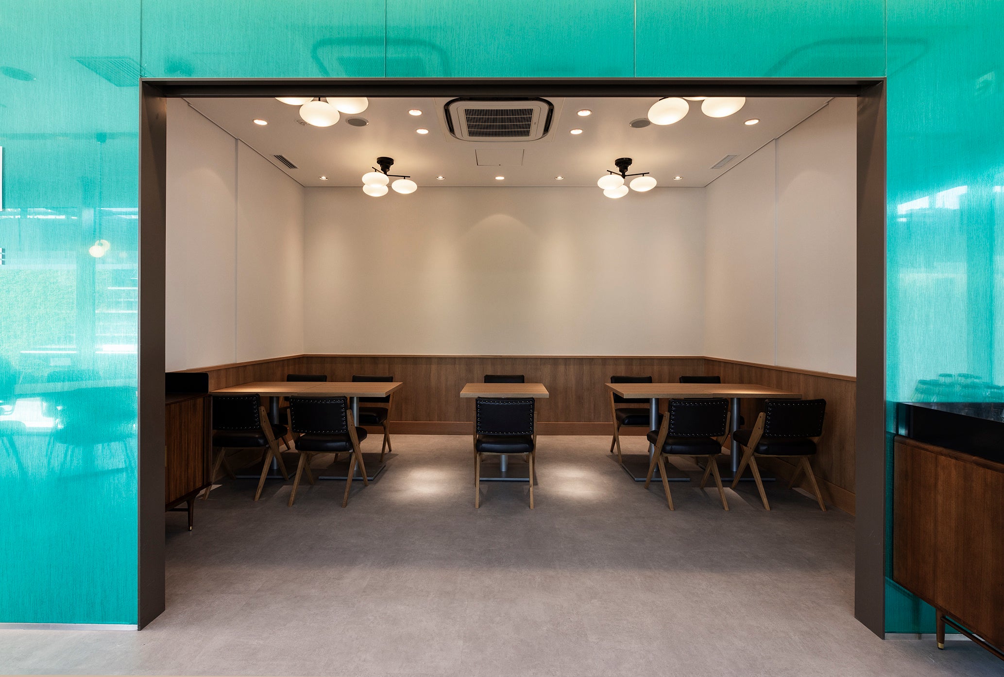 木素材をベースにした家具や多様な観葉植物にブルーグリーンのガラスウォールをアクセントにした店内環境は『新たな自然体』を十分に感じられる空間です。日常生活に少しの彩りと価値を提供というデザインコンセプトで、普段使いから記念⽇、家族や友人との食事など、多彩なシーンに対応できるデザインです。
