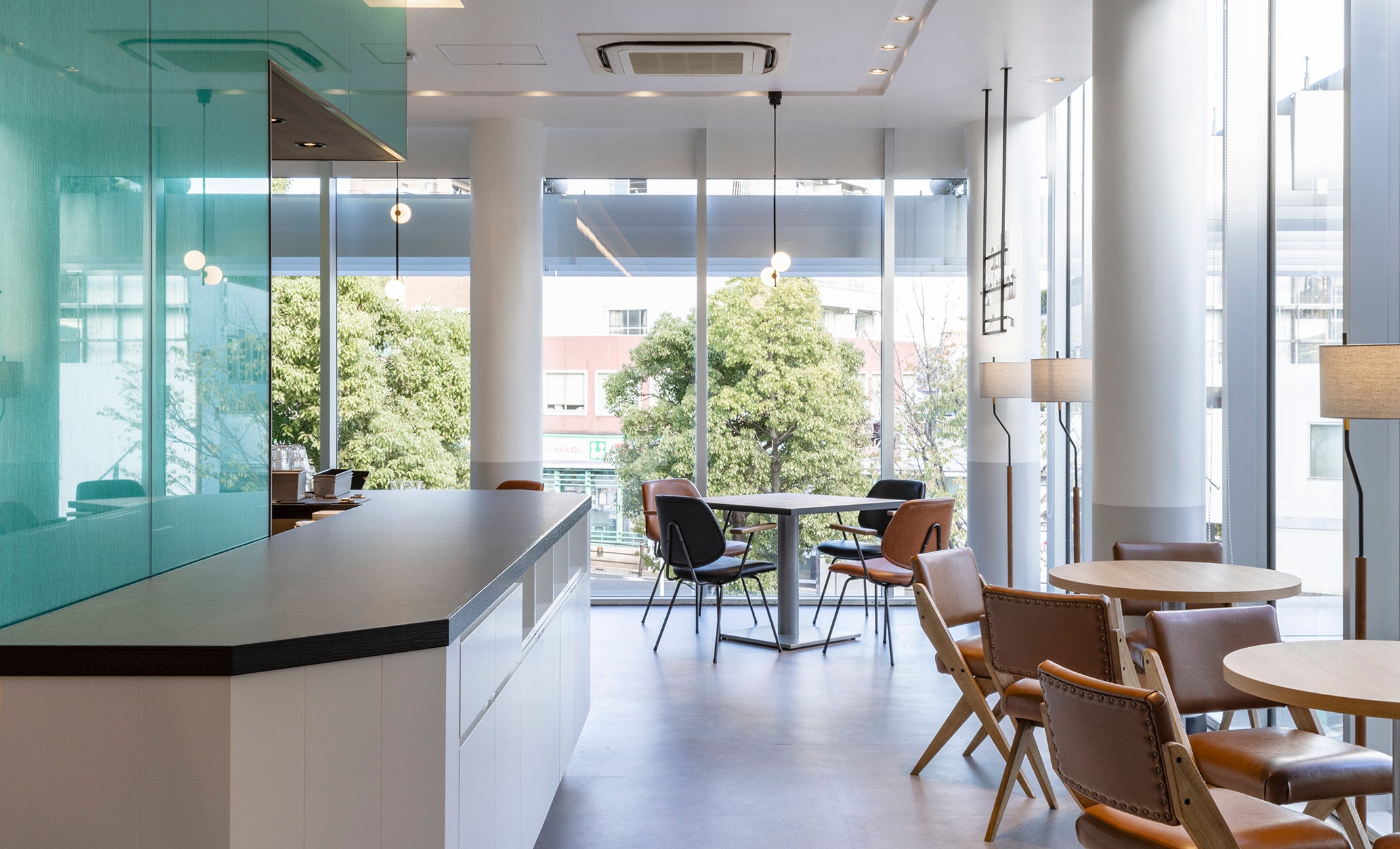 全⾯ガラス張りで太陽の光が心地よく差し込む開放的な店内では【NEW NATURAL】をテーマに上質でありながら肩ひじを張らないリラックスできる空間。