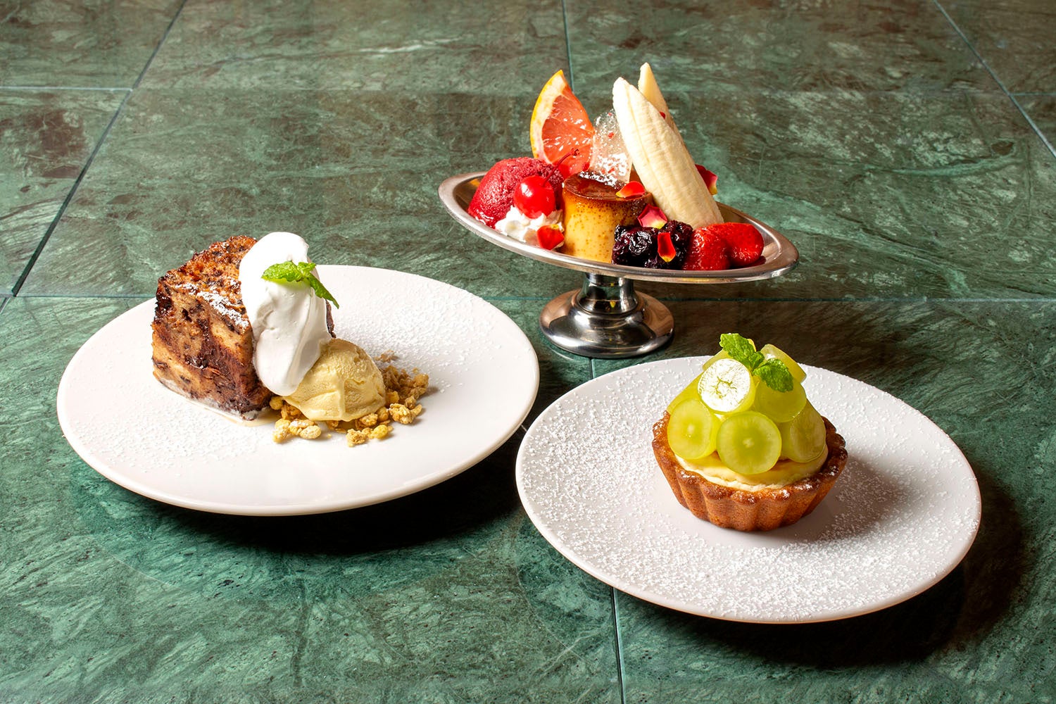 ルーツ、エディブルフラワーで華やかに表現した【blue terminal プリンアラモード】やblue terminal横浜のオープンから人気メニューの【チョコレートパンプディング】、季節のチーズタルトを提供。