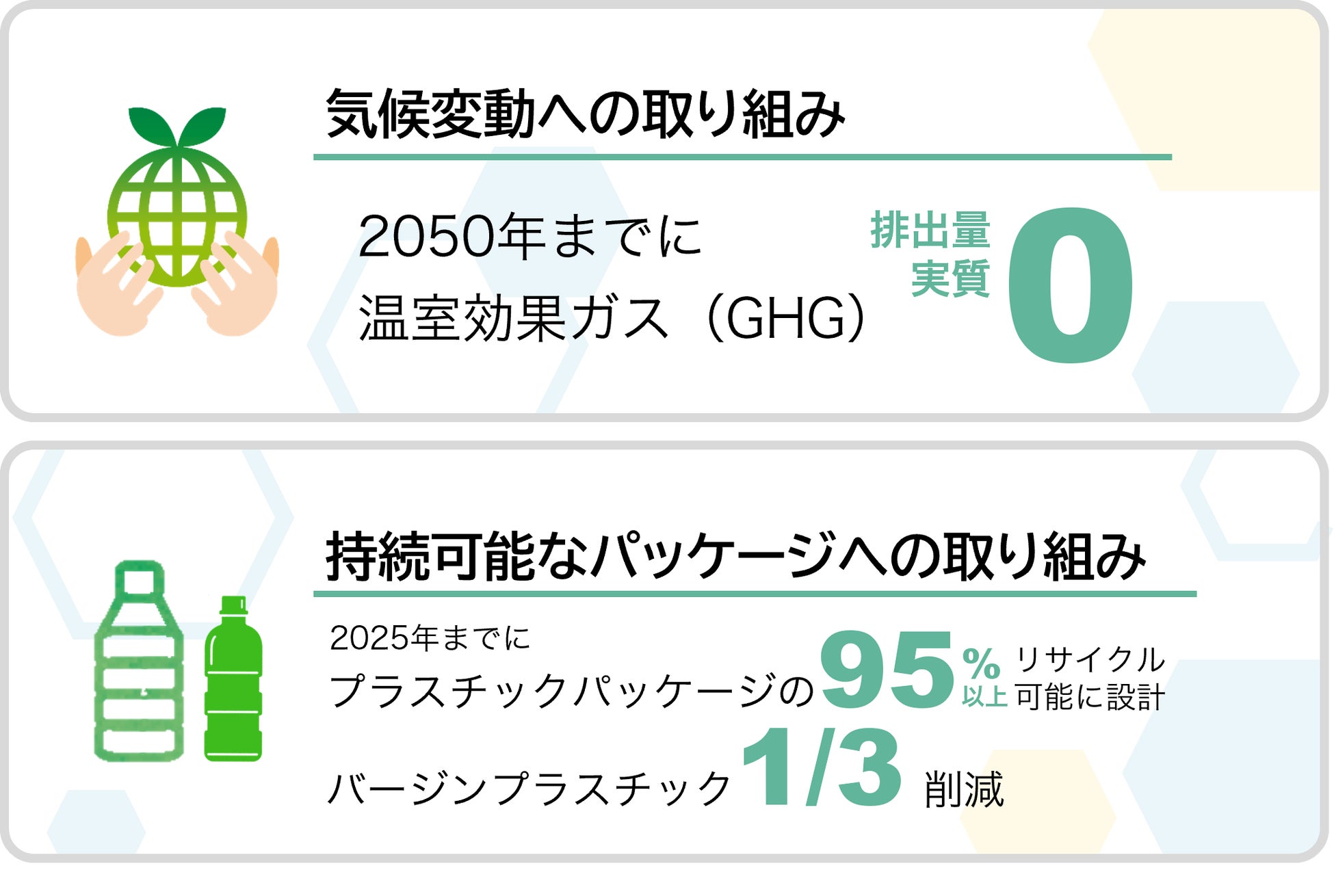 気候変動そして持続可能なパッケージへの取り組みについて、以下のコミットメントを掲げています。ネスレ日本においても、重点項目を定めて事業活動における取り組みを進めています。