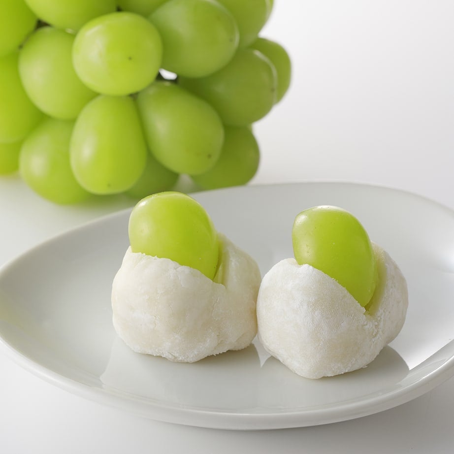 マスカットの果汁を使用した大福にシャインマスカットをはさみました。果実のフレッシュ感と大福の甘味がとてもよく合います。