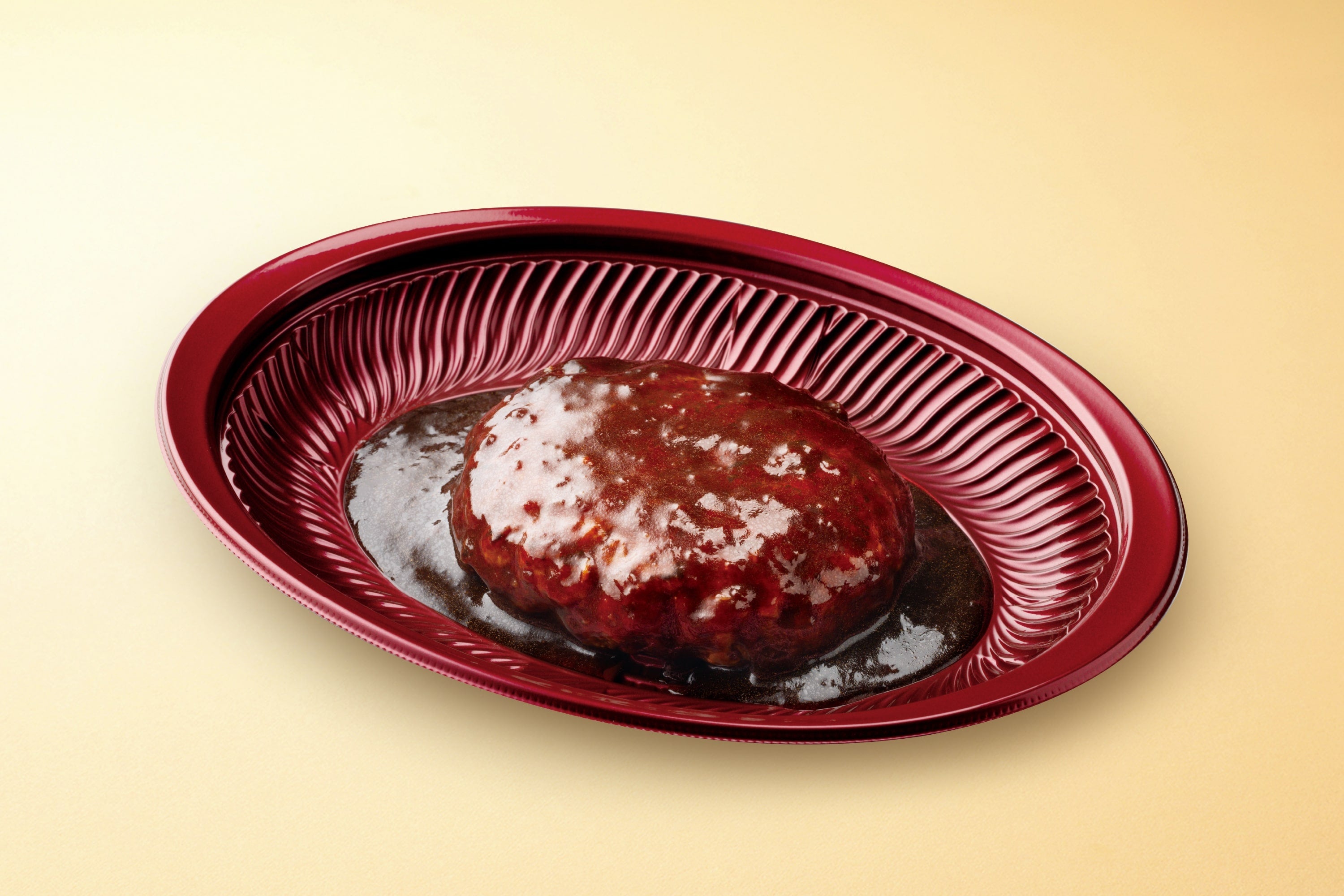 ハンバーグは、牛肉70%、豚肉30%の合挽肉を使用し、2層生地製法でふっくら形状、外は肉肉しく、中はジューシー。