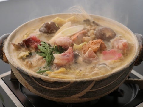 1月~2月極寒の日本海の荒波にもまれ脂ののった寒鱈(かんだら)を、頭から尻尾まで余すところなく味わえる郷土料理です。鱈の身を骨ごとぶつ切りにして内臓と一緒に鍋で煮込むので、地元 庄内ではアラまで楽しめる料理「”どんがら”汁」として親しまれています。(“どんがら”は、アラを指す言葉。)全国的には醤油で味付けられることが多い鱈鍋ですが「どんがら汁」は味噌を使って作られます。濃厚な肝や白子、アラから出る鱈の旨味が凝縮されたスープが、体の芯まで温めてくれます。