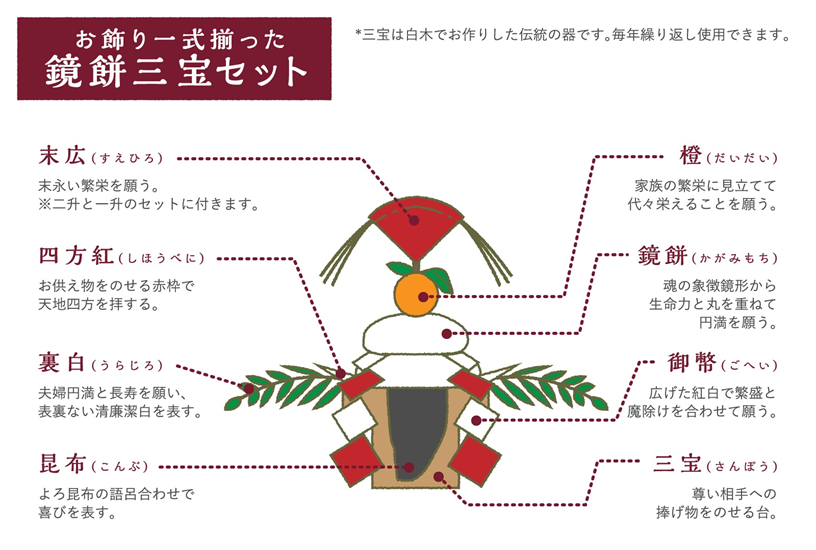 手間をかけずに本物を飾るヒノキ製「鏡餅三宝セット」。お飾りが一式揃ったお亀堂オリジナルです。