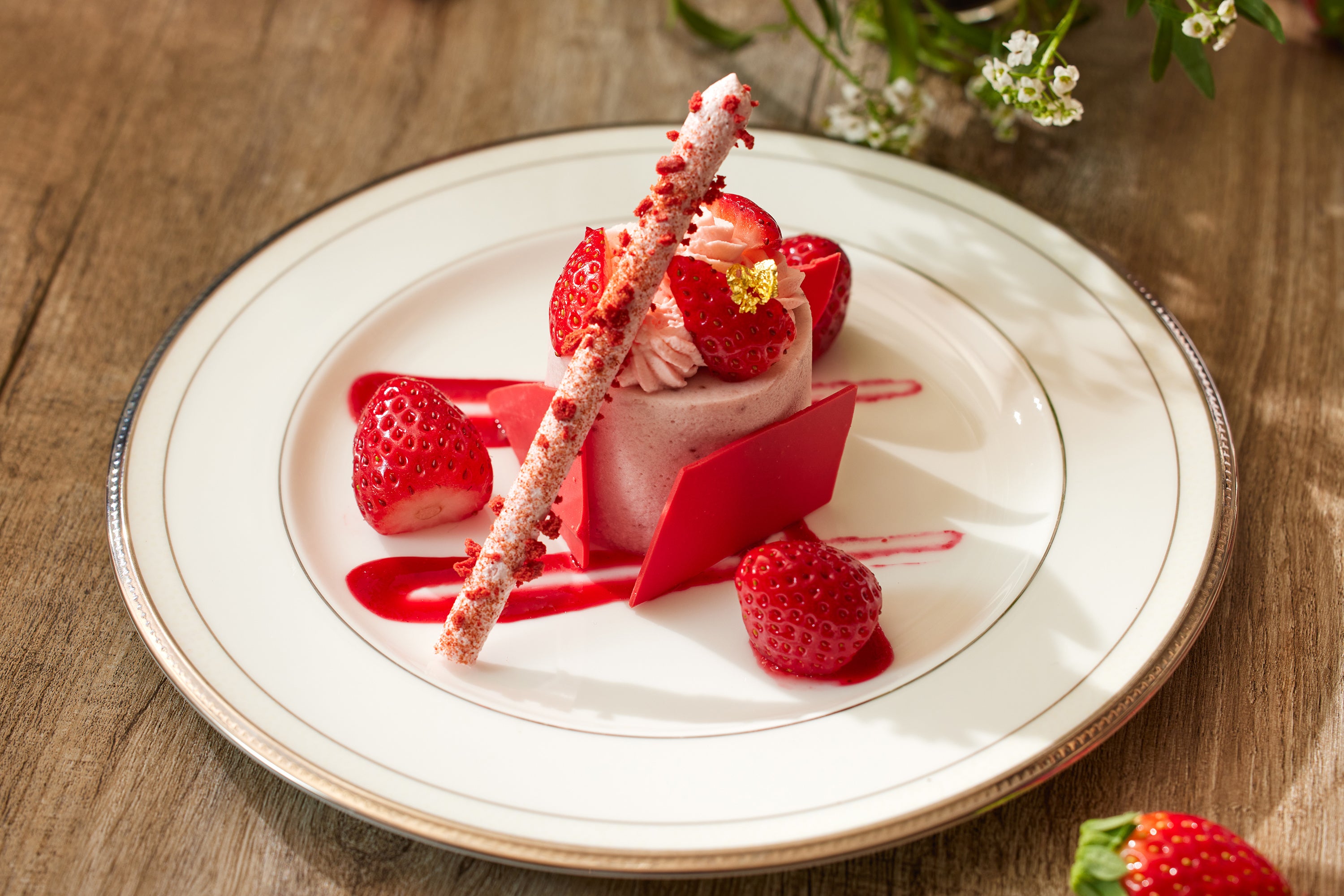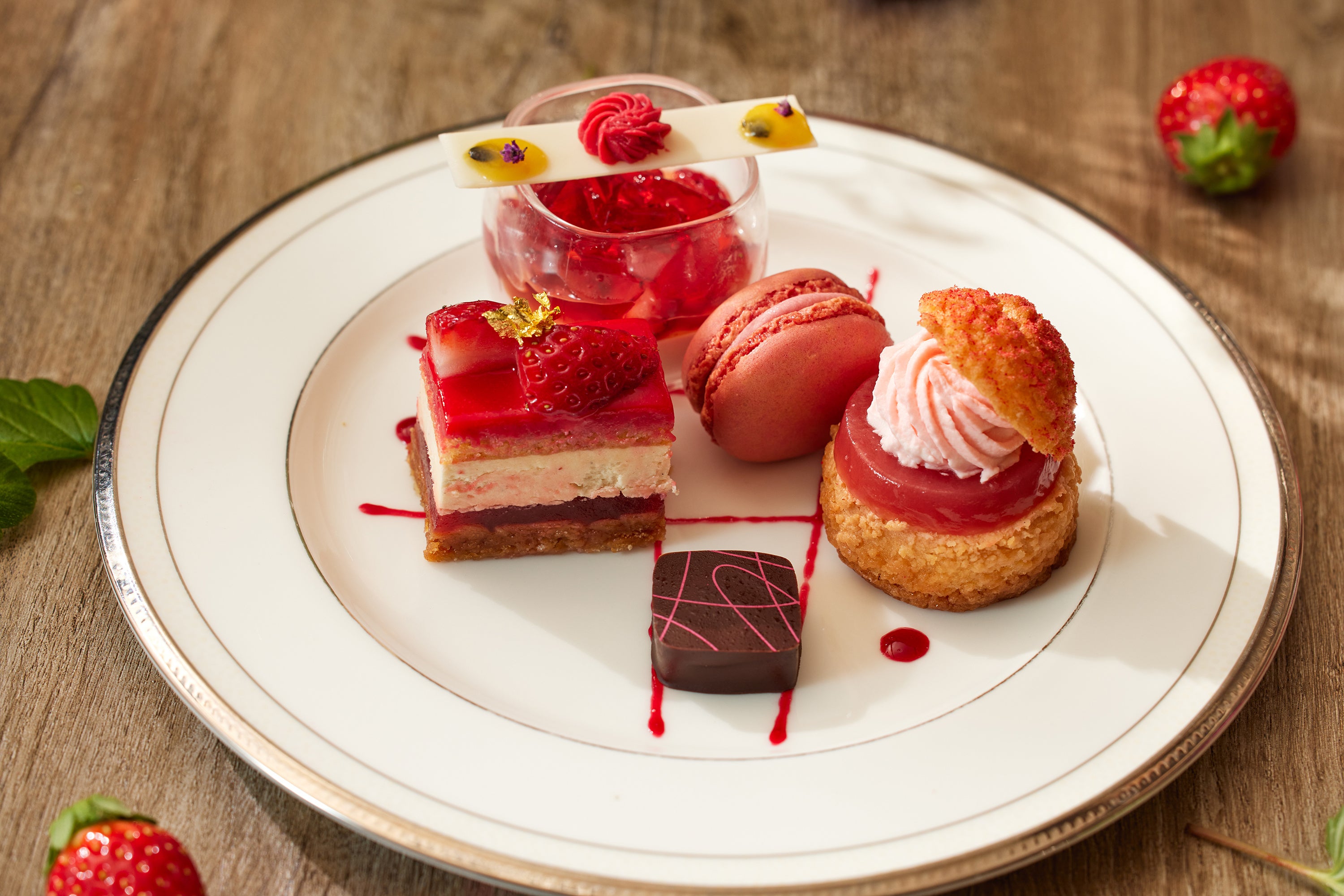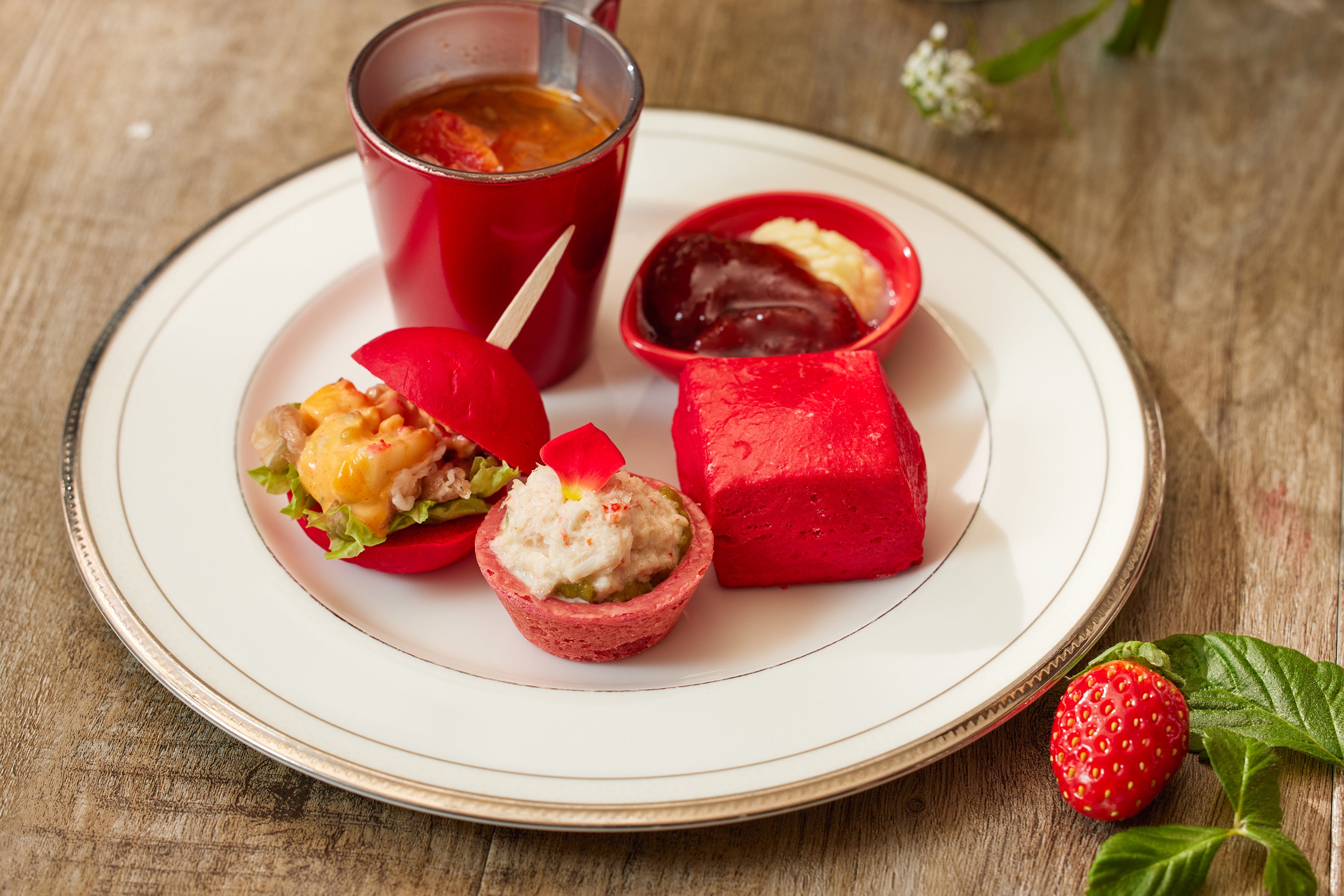 上段には、ルバーブのジュレと酸味のある柚子のクリームを閉じ込めた「あまおうのムース」に、深紅の色合いと濃い味わいが特徴のいちごの女王ロイヤルクイーンとメレンゲ菓子を添えて仕上げました。中段は、パンナコッタやマカロン、シュークリームなどを、多様にアレンジしたいちごスイーツを取り揃えました。「いちごのヴェリーヌ」は、いちごのパンナコッタにジュレを流し込み、グラスの上にパッションフルーツのソースを乗せたホワイトチョコレートを飾り、色合いのコントラストも美しい一品です。「いちごシュークリーム」は、サクサクに焼き上げた生地でいちごのカスタードクリームだけでなく、みずみずしいゼリーやなめらかなシャンティークリームを挟み、様々な食感がお楽しみいただけます。下段のセイボリーは、いちごピューレで真っ赤に焼き上げた「レッドストロベリースコーン」や、トマトジュースを使用したバンズでサニーレタス、ラディッシュ、生ハム、タルタルソースをサンドした「レッドバーガー」など、鮮やかなレッドカラーを基調としたラインアップをご堪能いただけます。