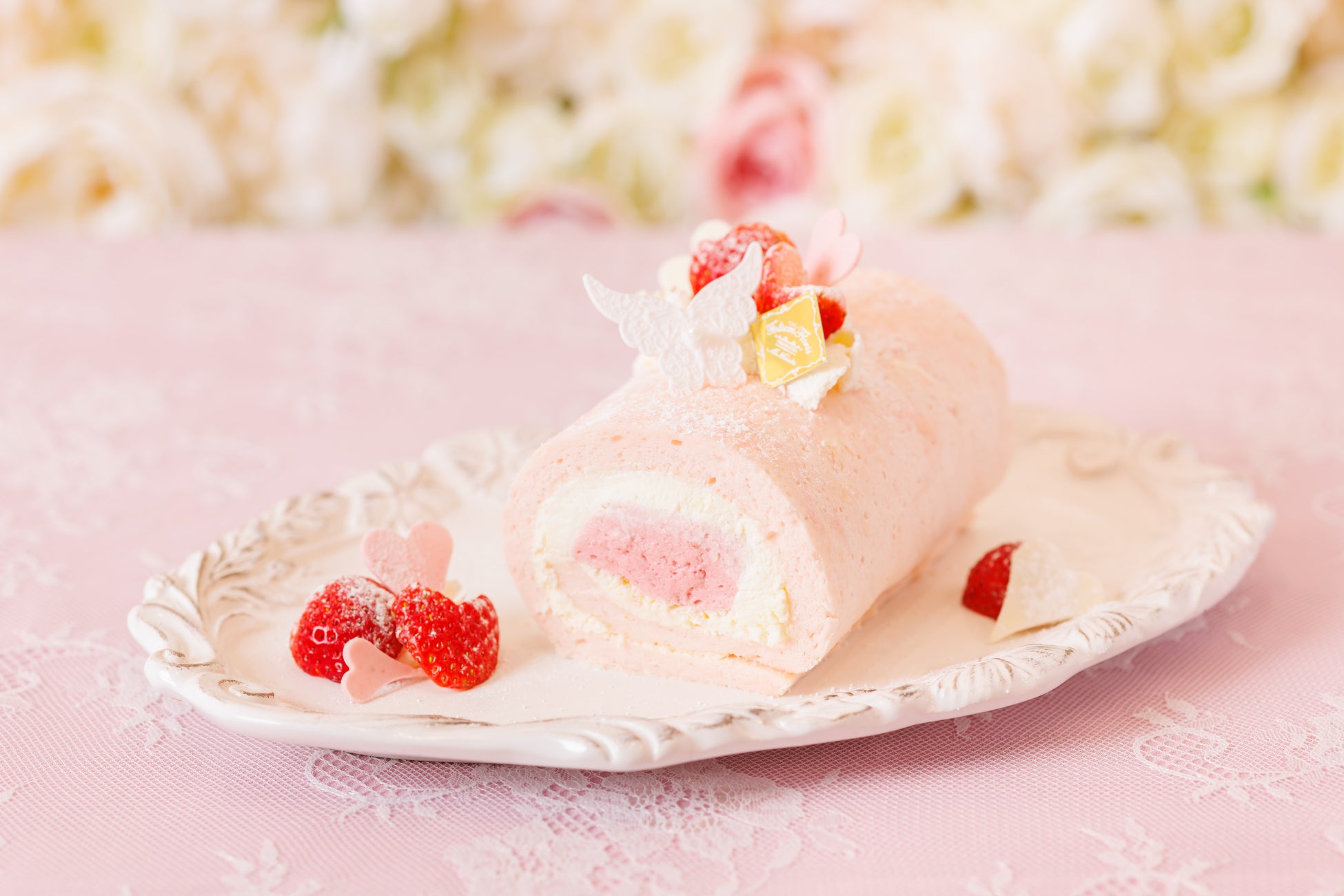 ハートストロベリーを飾ったピンクのロールケーキの上に、季節やシチュエーションに合わせたお好きなシュガーレース2枚をお選びいただき、トッピングしてお楽しみいただけます。