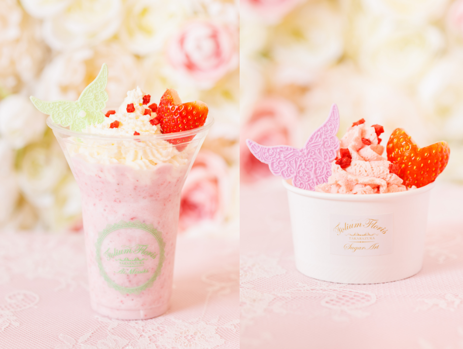 甘酸っぱく香る苺と、北海道産ミルクの優しい味わいのジュースや苺のアイスクリームに、ハート型のストロベリーとお好きなシュガーレースを華やかに添えてお楽しみください。