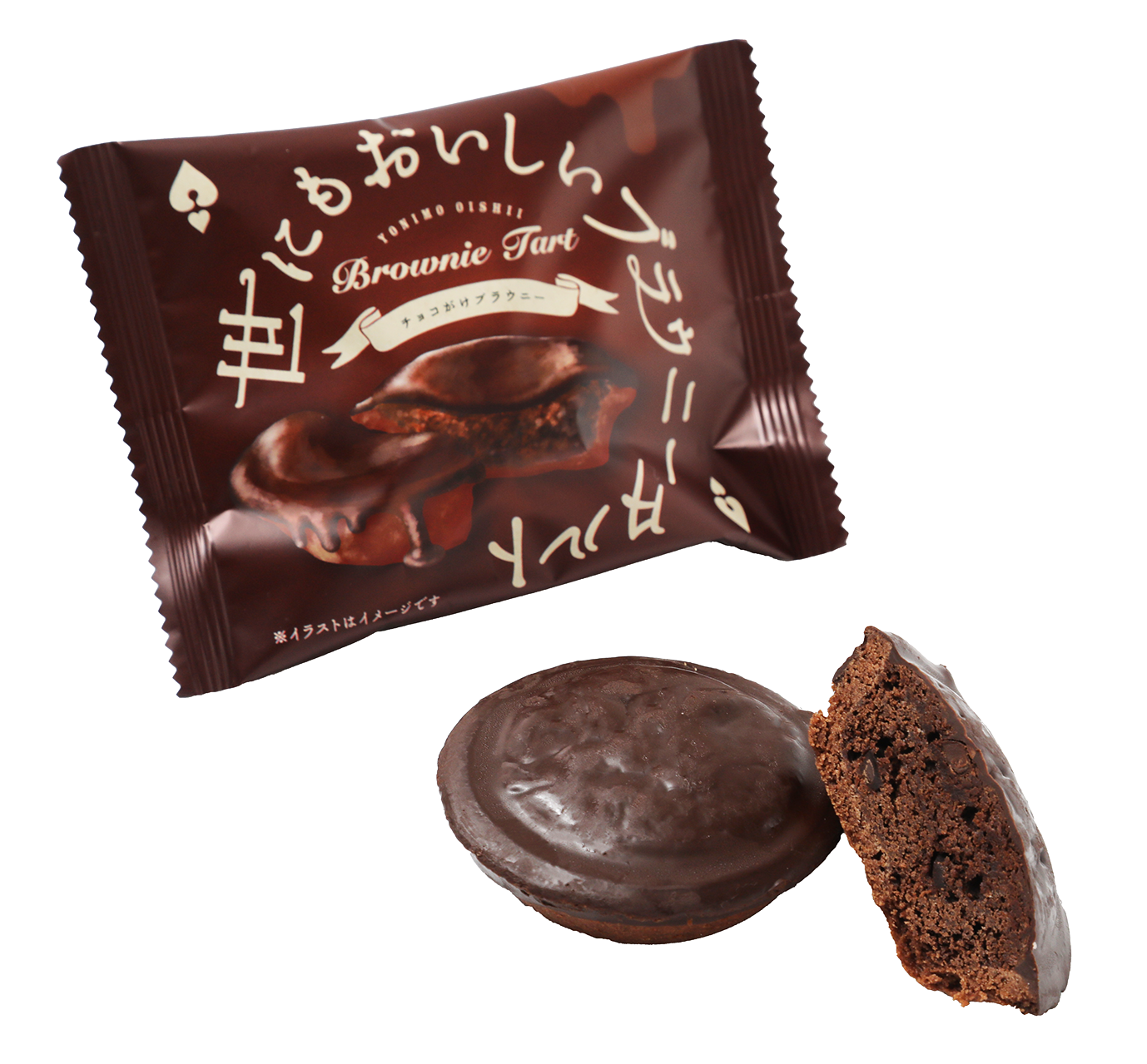 『世にもおいしいブラウニータルト チョコ』は、濃厚なオリジナルチョコを使用したチョコブラウニーの生地をココアタルトに流し込んで焼き上げ、ブラックチョコのコーティングで仕上げました。