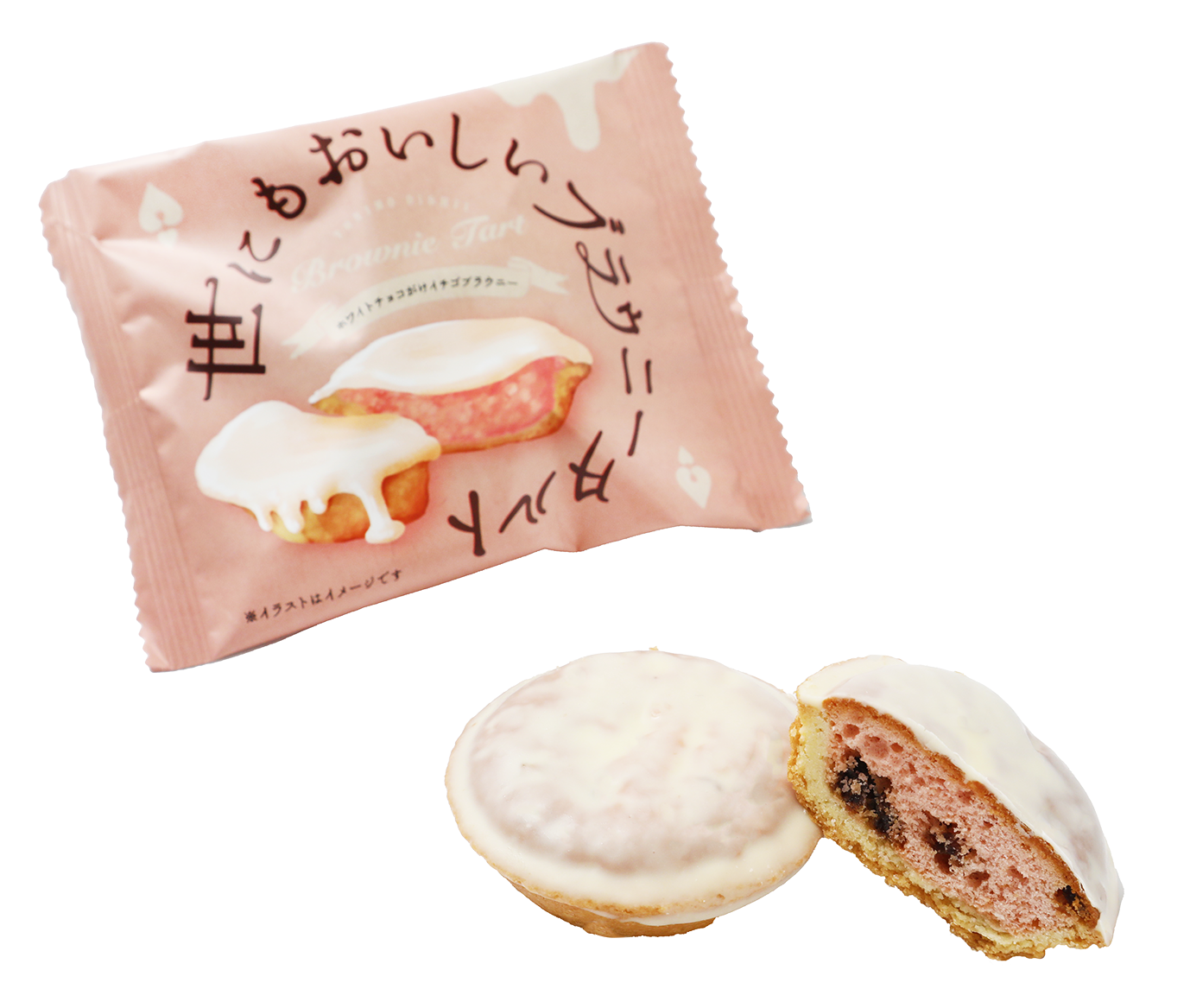 こだわり:・ドライイチゴを練り込んだイチゴ風味のブラウニー生地をタルトに流し込んで焼き上げ、ホワイト