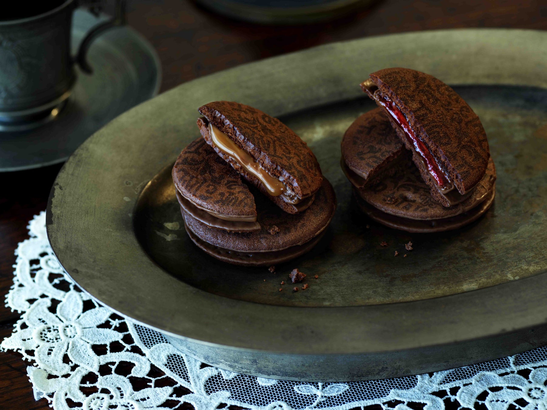風味豊かな2種類のソースをミルクチョコレートでコーティングし、さっくりと焼き上げたココアクッキーでサンドした、贅沢な味わいのショコラサンドです。